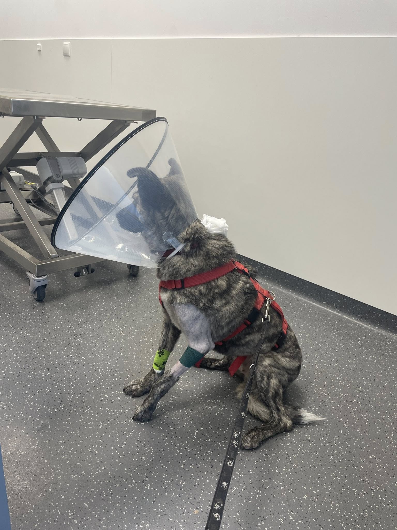 Sira muss nun 4 Wochen strikt ruhig gehalten werden, damit das Gelenk heilen kann. Danach beginnt ein langsamer und vorsichtiger Wiederaufbau der Muskulatur.