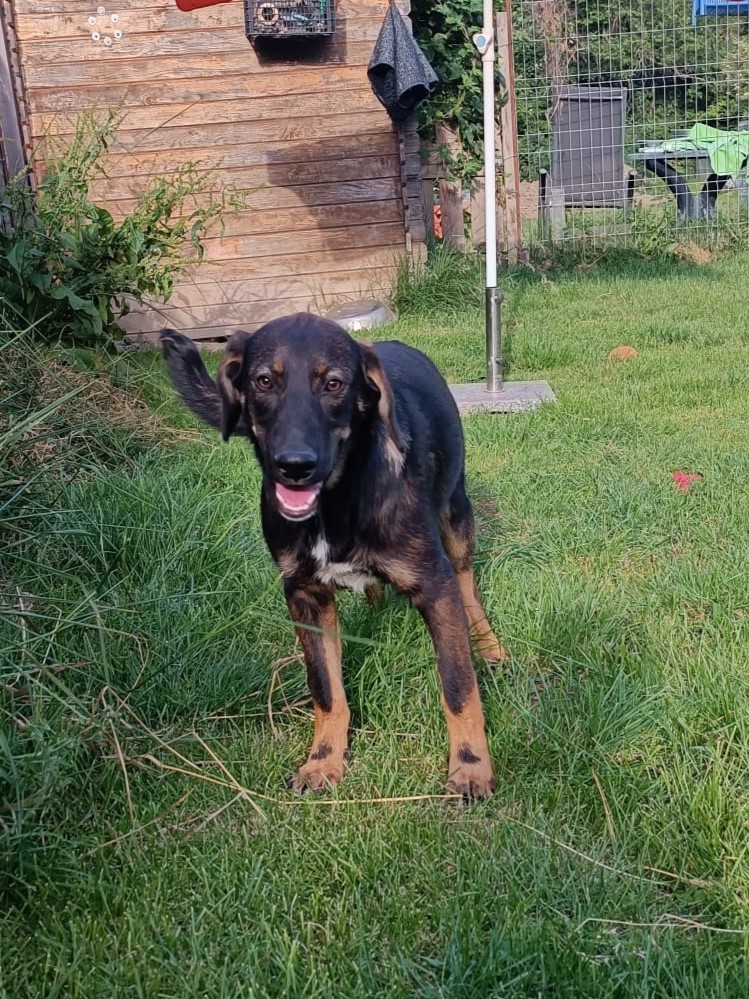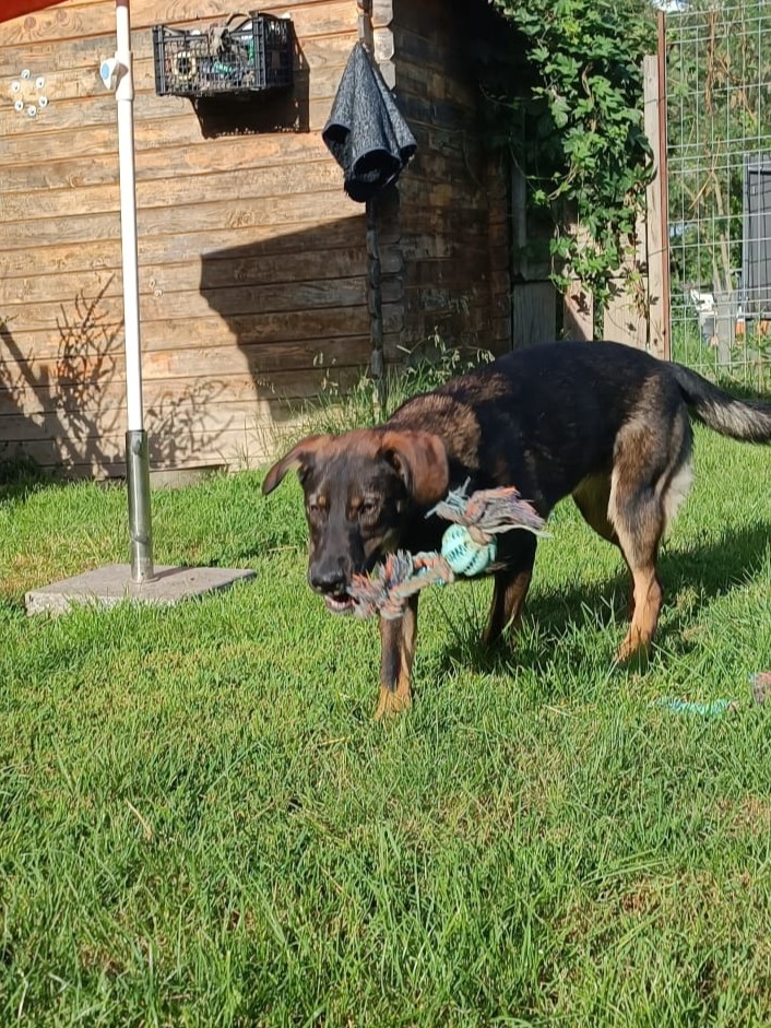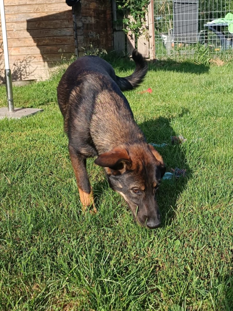 Aus dem anfangs sehr zutraulichen, verschmusten und verspieltem Welpen, wird langsam ein schüchterner Junghund, der aber nach kurzer Zeit noch gut anfassbar und verkuschelt ist.